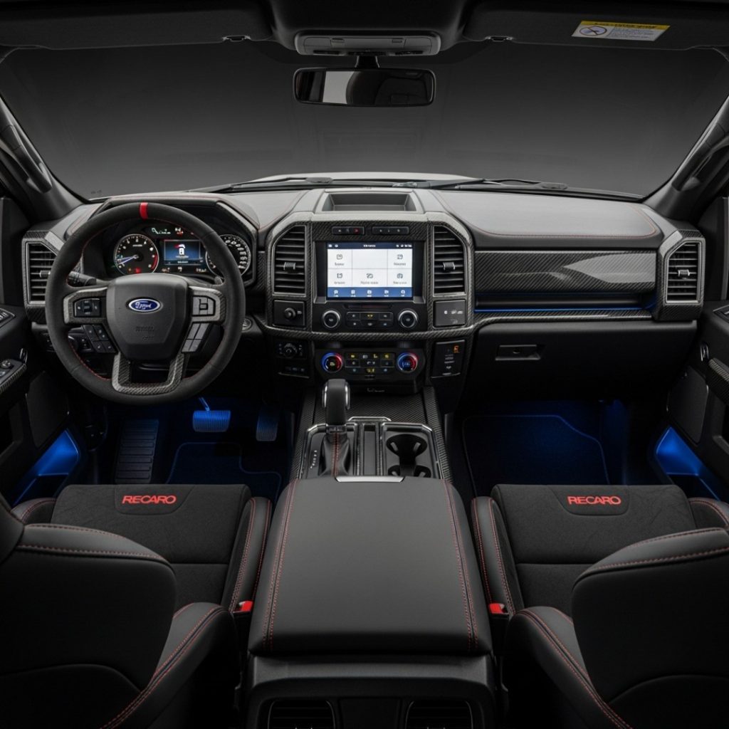 • Dashboard & Materials: The cabin is dominated by the large 12-inch digital instrument cluster and the equally massive 12-inch Central Touchscreen Infotainment System. While the overall layout is truck-like, the materials on the Raptor R are premium: carbon-fibre accents, Recaro leather/Alcantara seats, and contrast stitching. The quality is a massive step up from older Ford trucks.