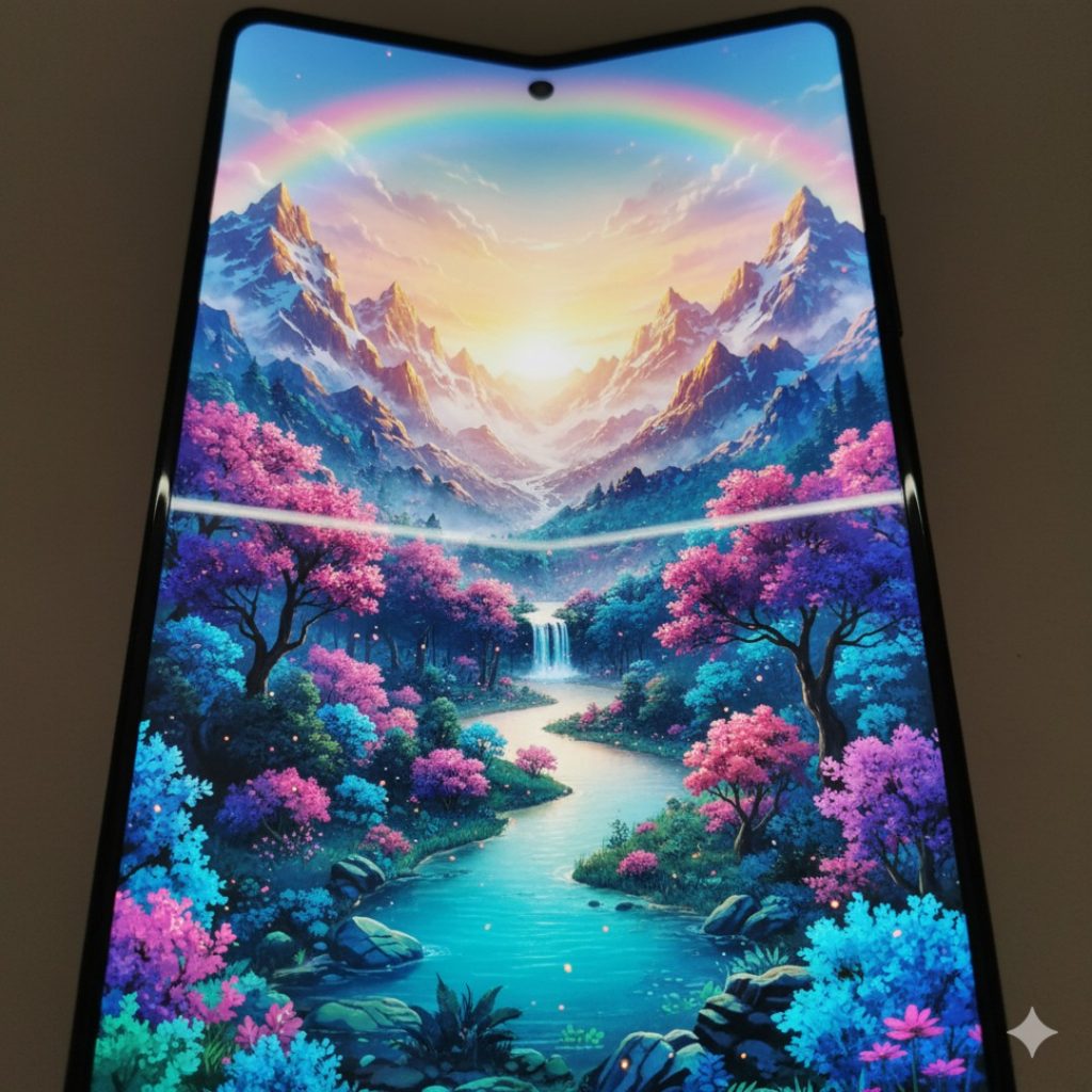 Close-up of the inner 8.2-inch display of the Galaxy Z Fold 8 showing a vibrant, colorful 8K landscape wallpaper.